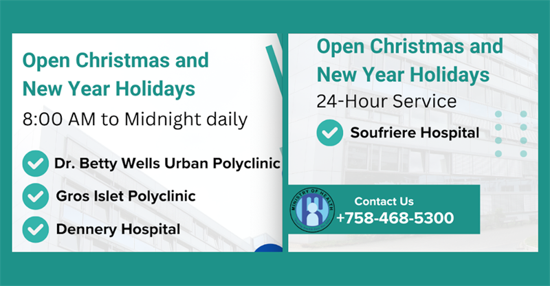 - Dennery Hospital, Gros Islet Polyclinic, and Dr. Betty Wells Urban Polyclinic: These facilities will remain open during the Christmas and New Year holidays, operating from 8:00 AM to Midnight daily.